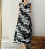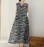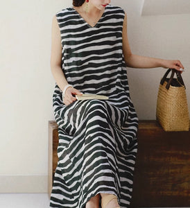 Lightweight Striped Print V-neck Sleeveless Ramie Dress 6633