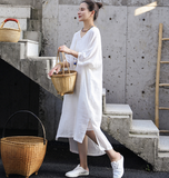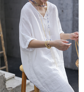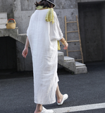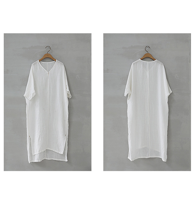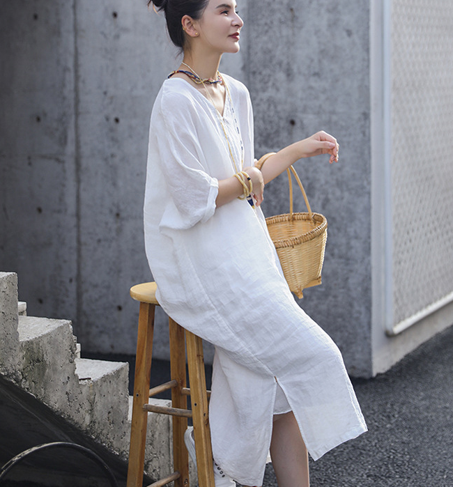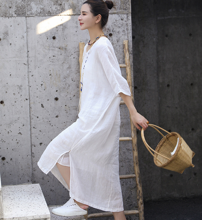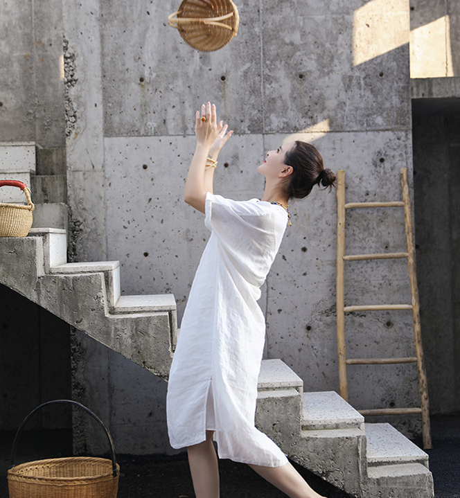 Slit White Linen Summer Women Dresses Short Sleeve Long Loose Women Dresses 17292