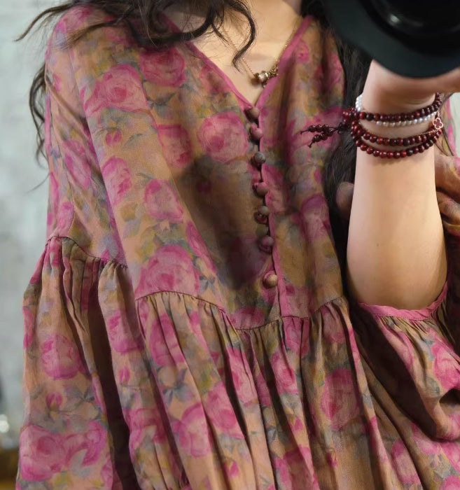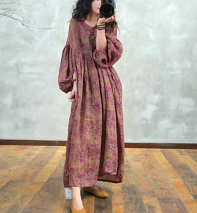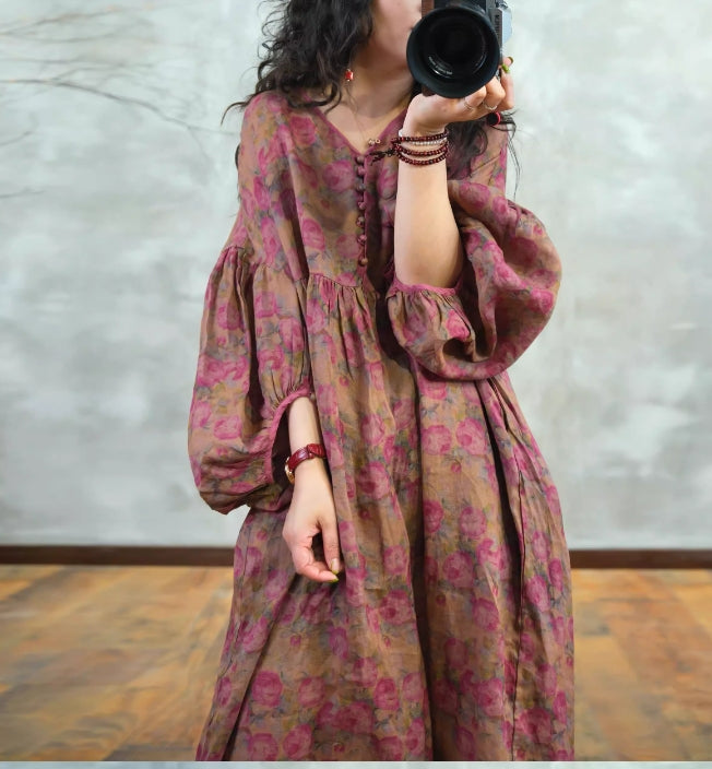 Summer Stylish Lantern Sleeve Floral Print Ramie Dress/1212