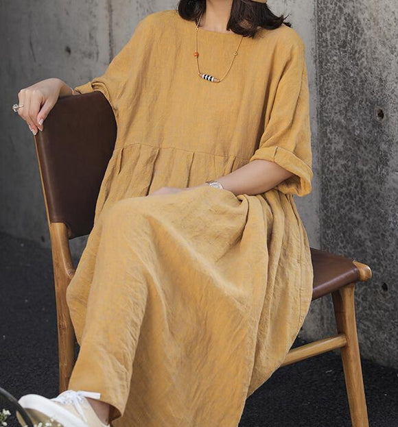 Square Neck Summer Women Linen Dresses Loose Summer Linen Raglan Sleeve Long Women Dresses 7729