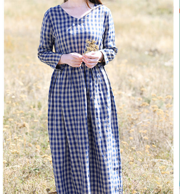 Checked Summer Dresses Linen Short Sleeve Long Women Dresses 97291