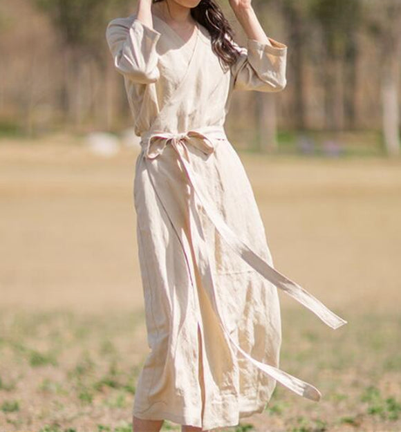 V Neck Summer Women Linen Dresses Washed Soft Linen Summer Dresses 7292