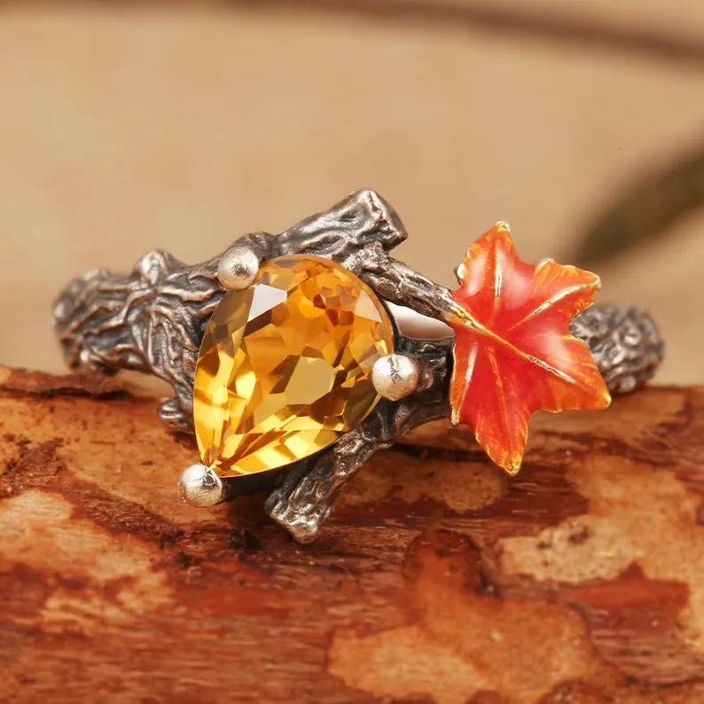 Natural Amethyst Maple Leaf engagement ring Set Leaf Branch Amethyst Gemstone Ring Maple Leaf Sterling Silver Ring Unique Pear Amethyst ring