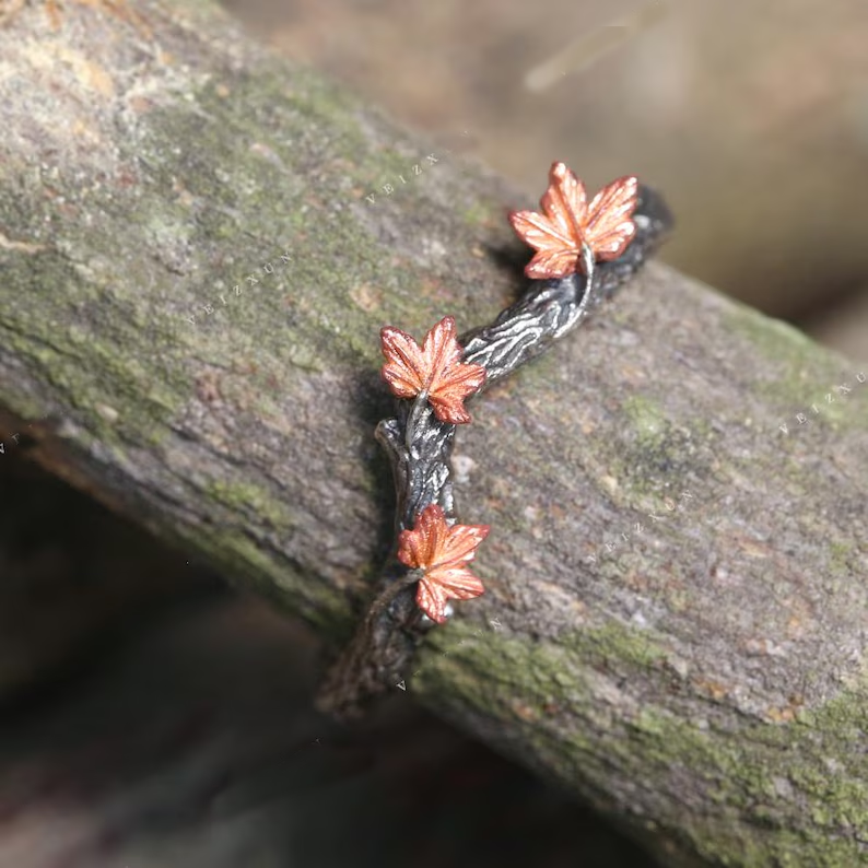 a beautifully handcrafted vintage branched Emerald ring - a stunning tribute to the beauty of the natural world. Each piece is meticulously designed with delicate branches gracefully surrounding a captivating moss agate gemstone, adorned with a charming orange maple Leaf