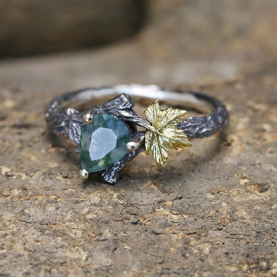 Natural Pear Moss Agate Ring Set Unique Green Moss Agate Tree Branch Ring Twig and Leaf Ring Maple Leaf Ring Agate Leaf Engagement Ring