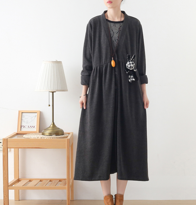 Gray V Neck Corduroy Buttons Dresses Loose Winter Autumn Dresses Casual Women Dresses ZRL97213