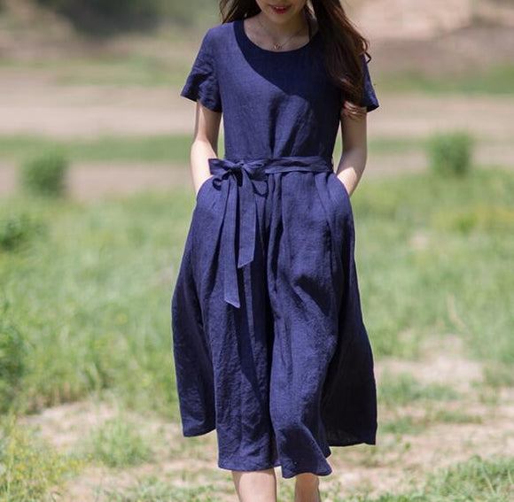 Summer Linen Women Dresses Sleeves O Neck Dresses CH9515