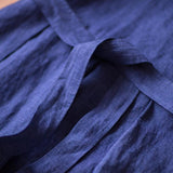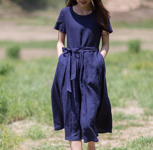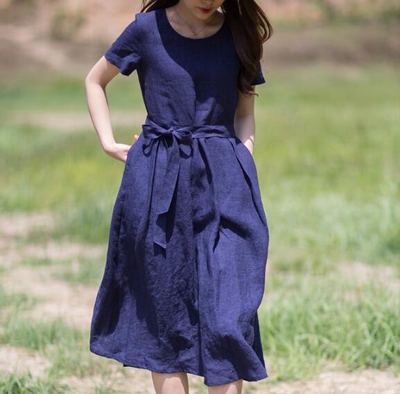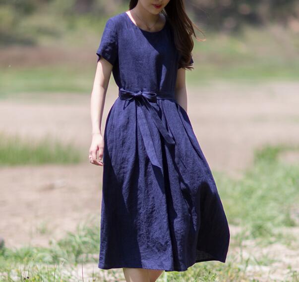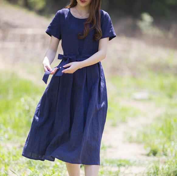 Navy Linen Dresses O Neck Waist Belt Summer Midi Dresses XH9527