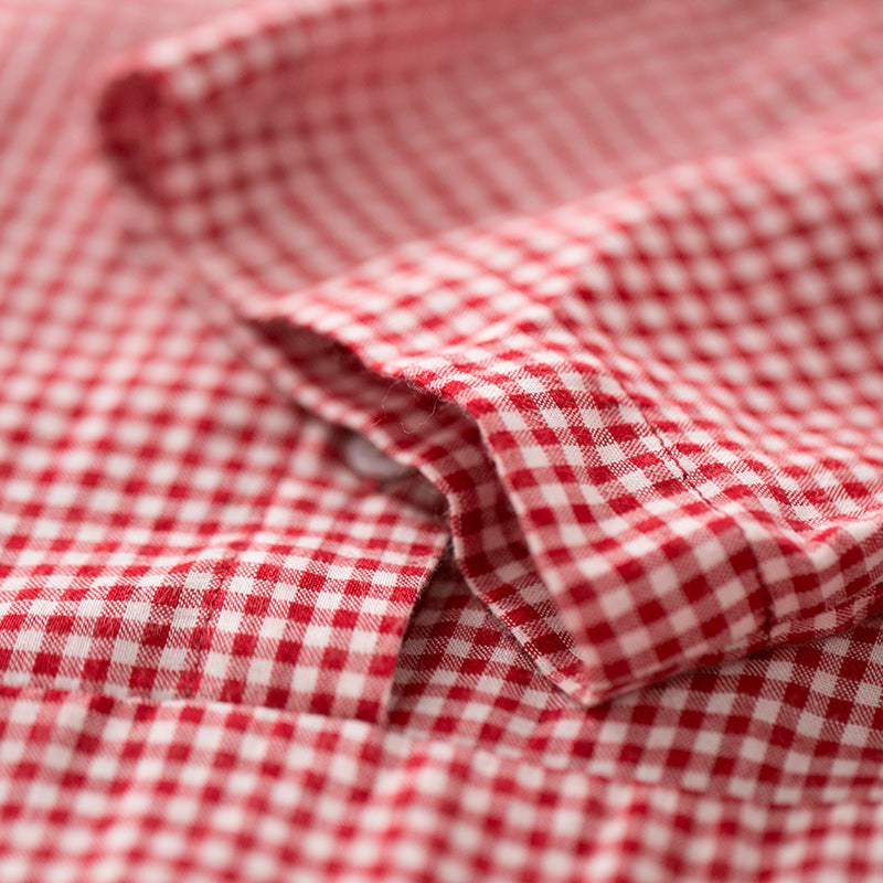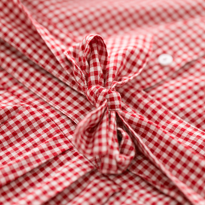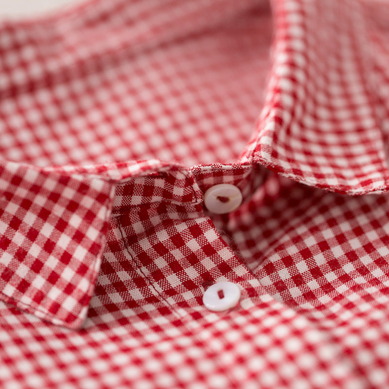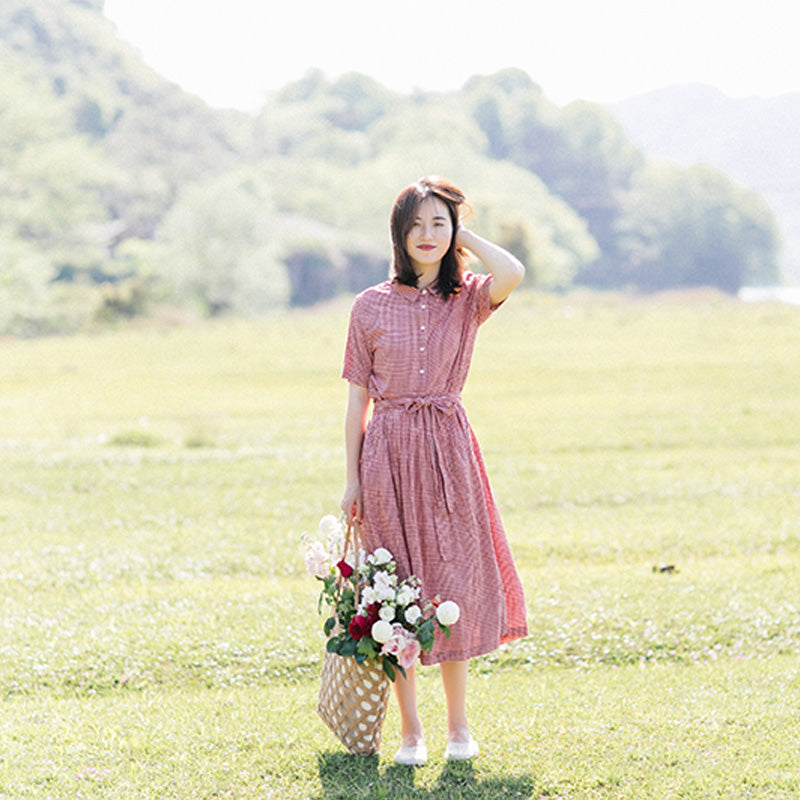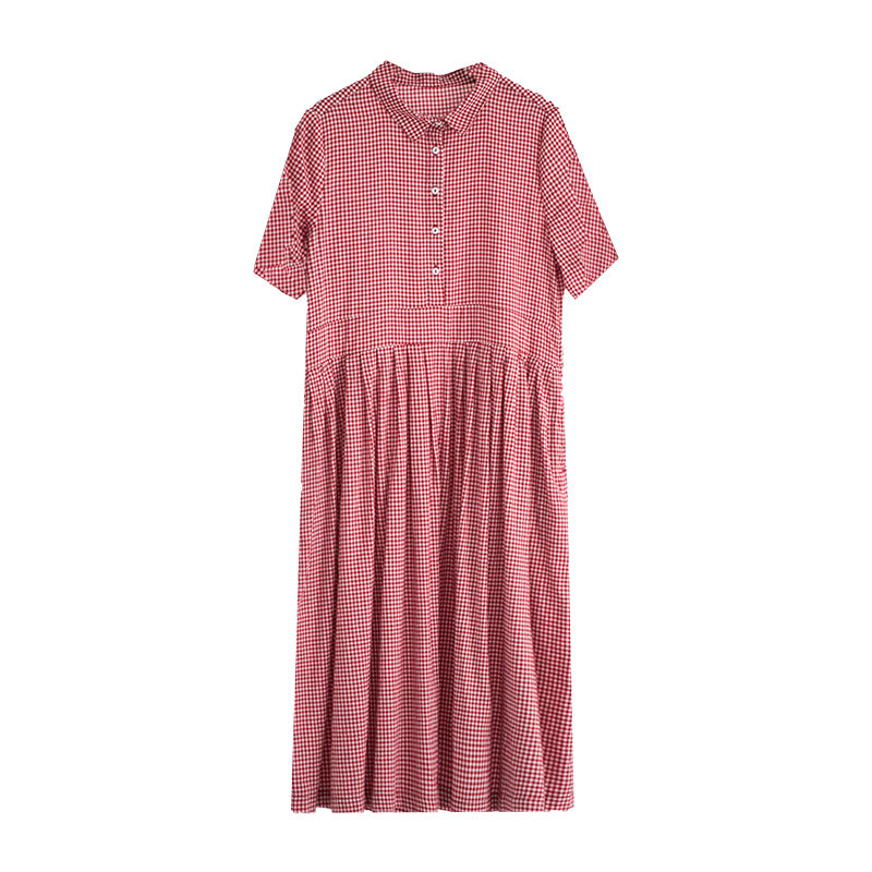 Red Checked 100% Linen Women Dresses Short Sleeves Spring Summer Women Dresses XH9609