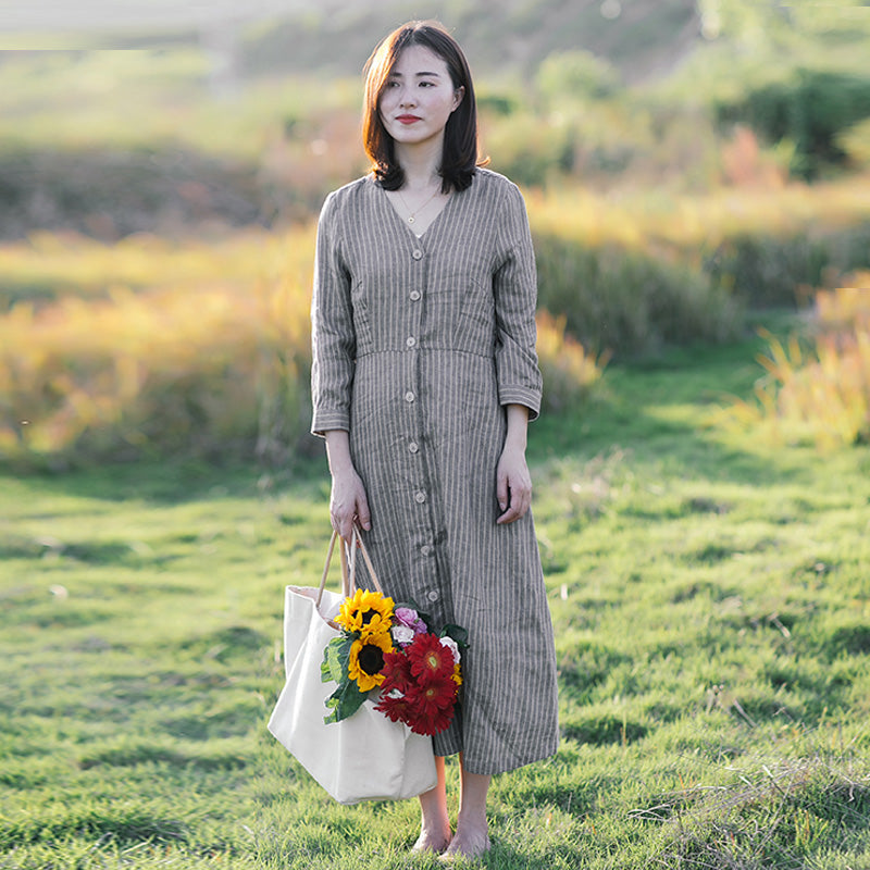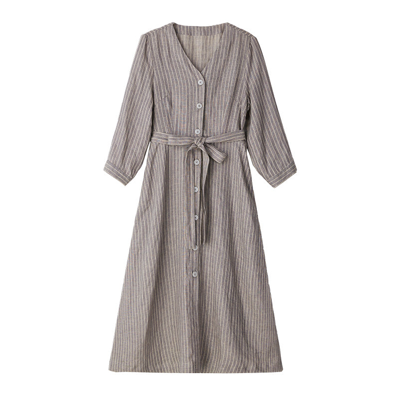Plaid 100% Linen Women Dresses 3/4 Sleeves V Neck Shirt Dresses Spring Summer Women Dresses XH9650