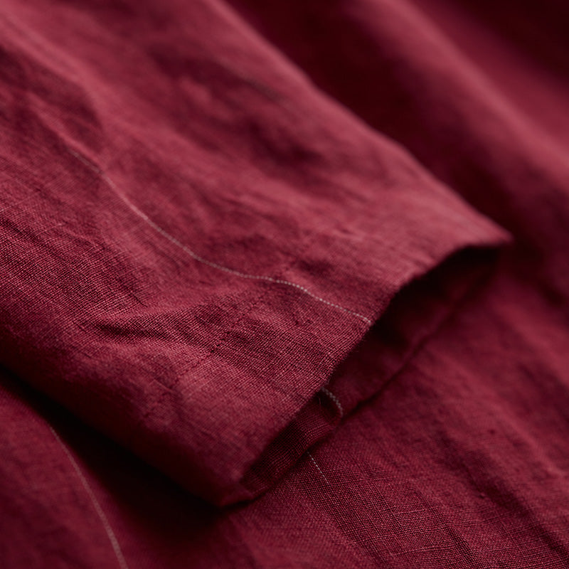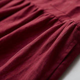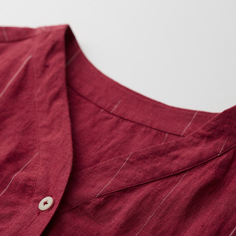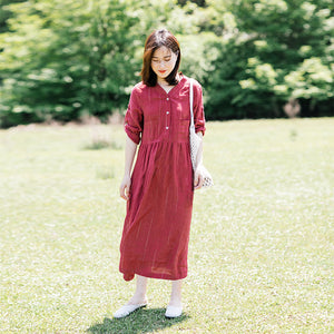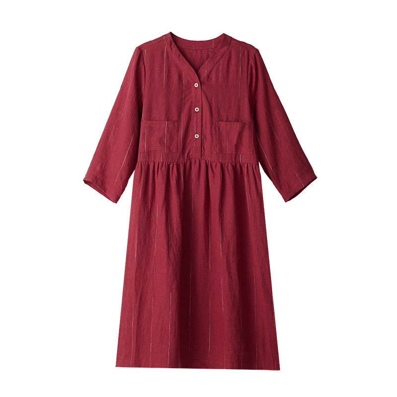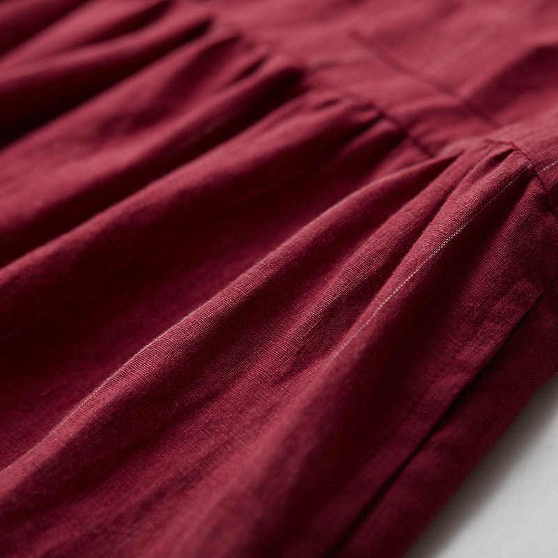 Red Linen Buttons V Neck Pleated Midi Dresses XH9652