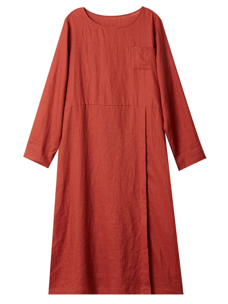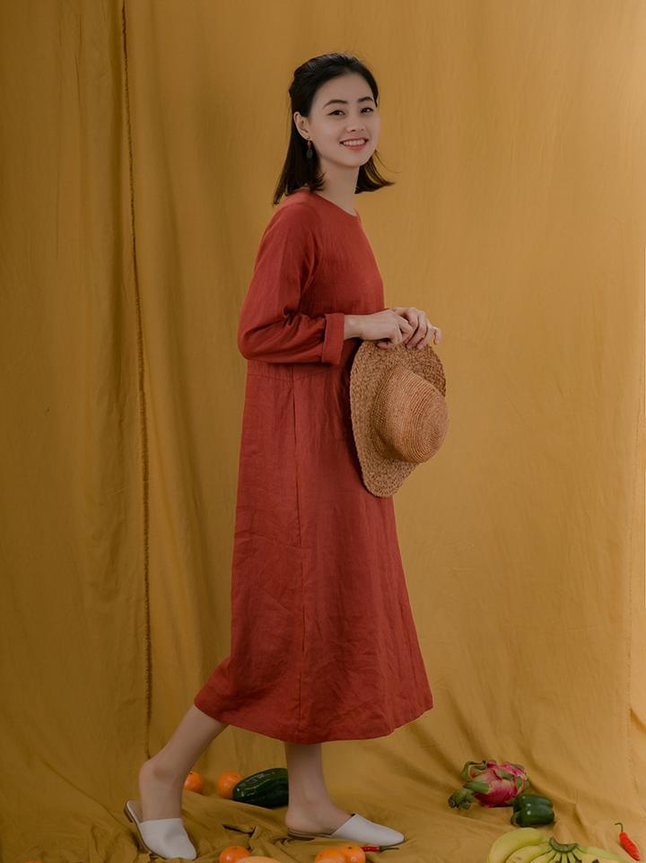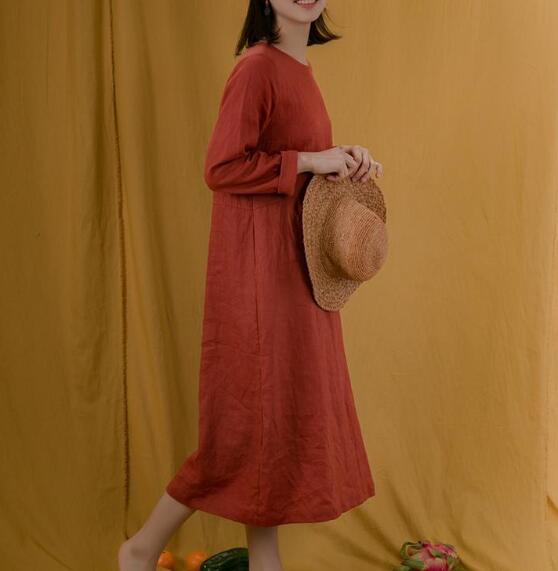 Red Linen Women Dresses Long Sleeves U Neck Spring Summer Women Dresses XH9671
