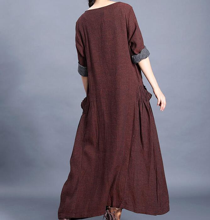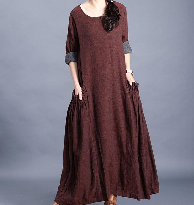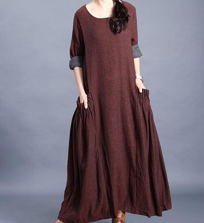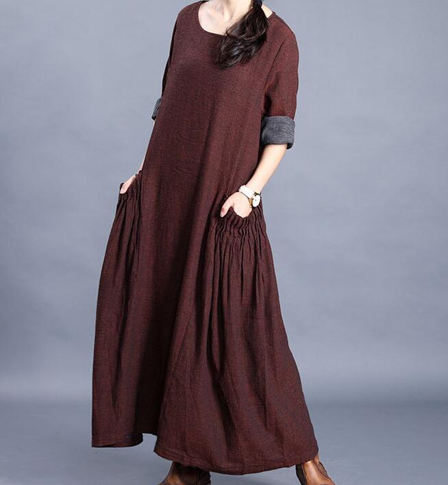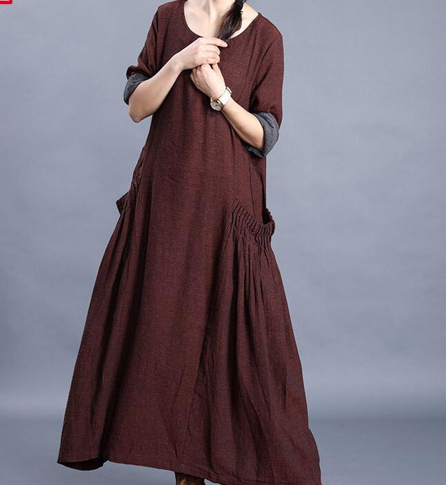 O Neck Pleated Side Pockets Long Sleeve Print Linen Women Maxi Dresses /0122