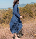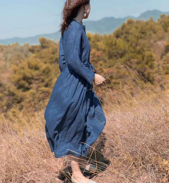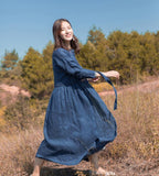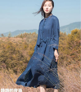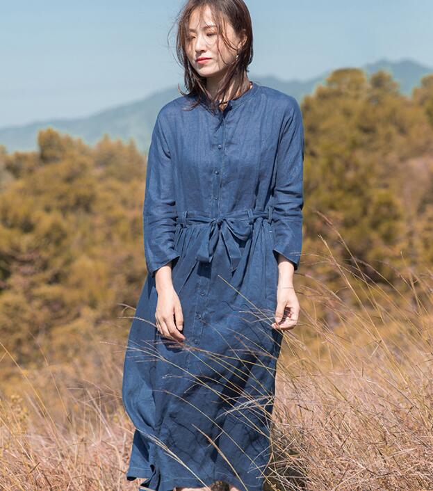 Navy Linen Long Sleeve Autumn Women Shirt Linen Dresses S90921