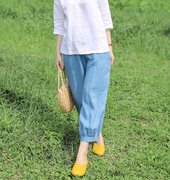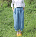 Light Blue Summer Loose Linen Wide Leg Women Casual Pants WG05131