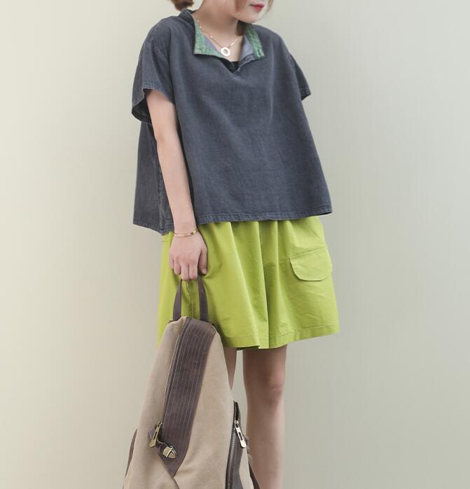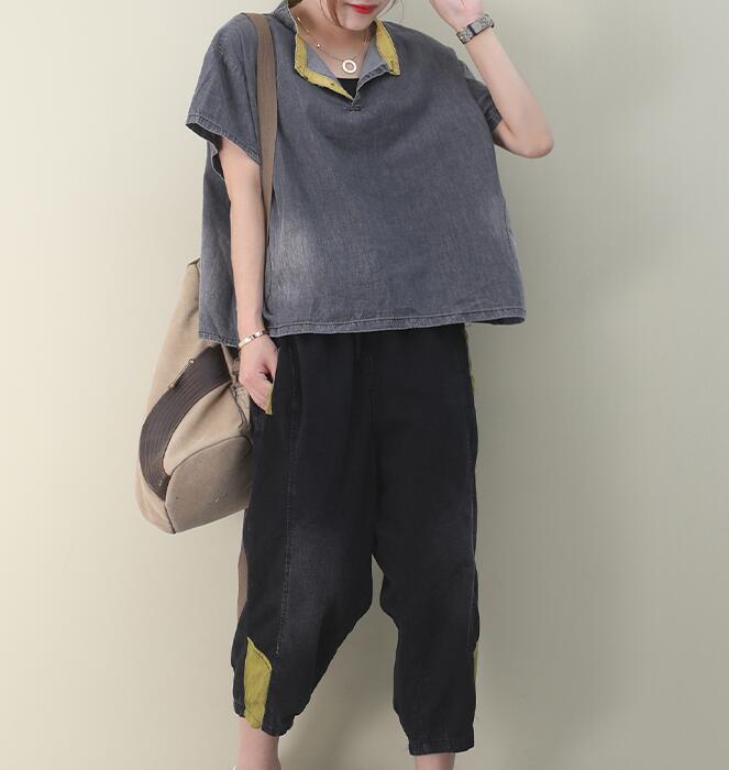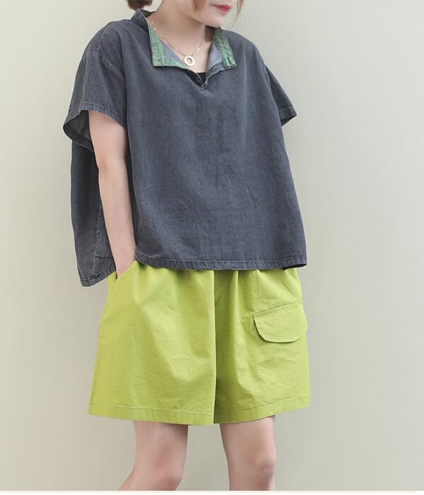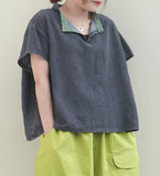Color Block Collar Loose Casual T-Shirts Summer Women Cotton Tops WG961707