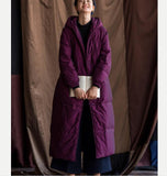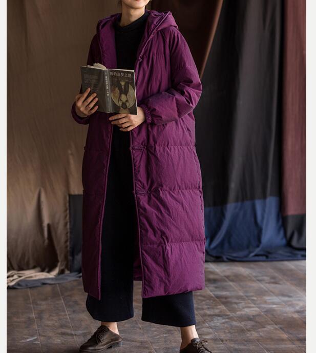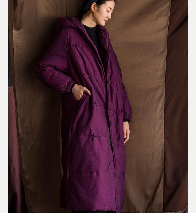 Purple Long Chinese Buttons Hooded Down Jacket Women Down Coats