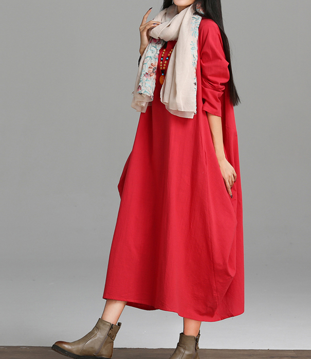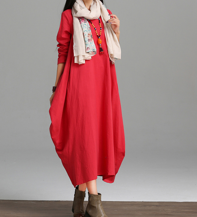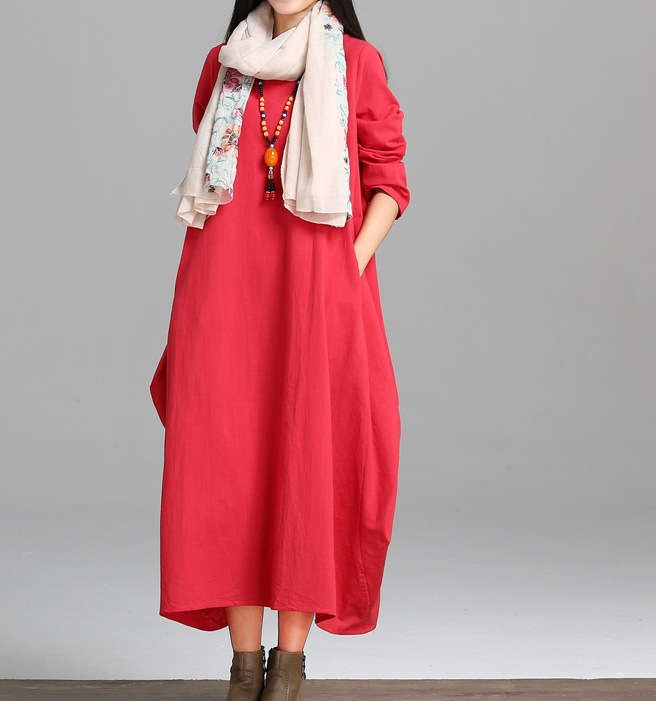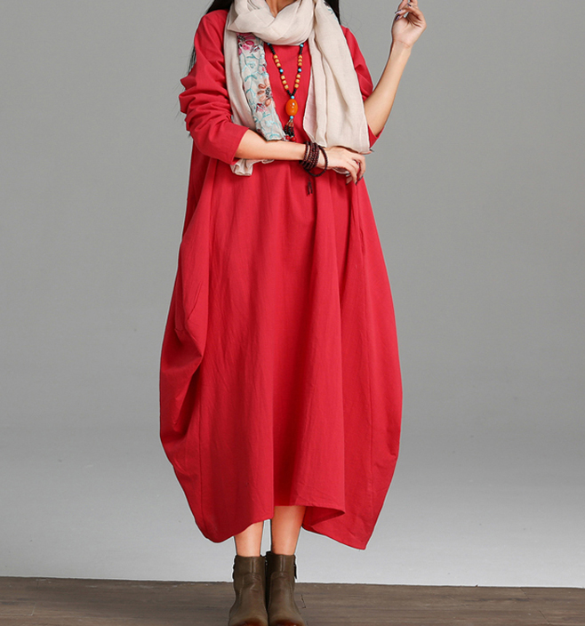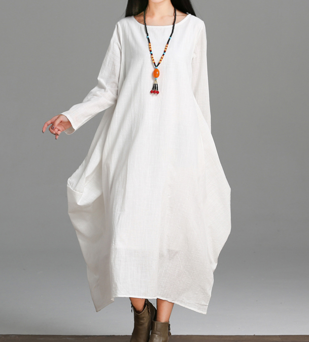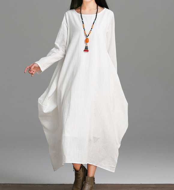 Loose Long Sleeve Linen Cotton O Neck Women Dress