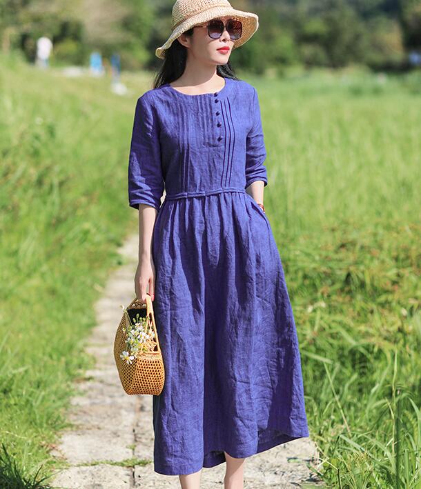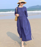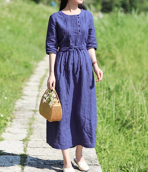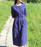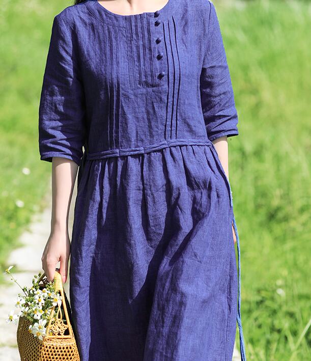 Navy Blue Women Dresses Ramie Casual Spring Linen Women Dresses SSM97215