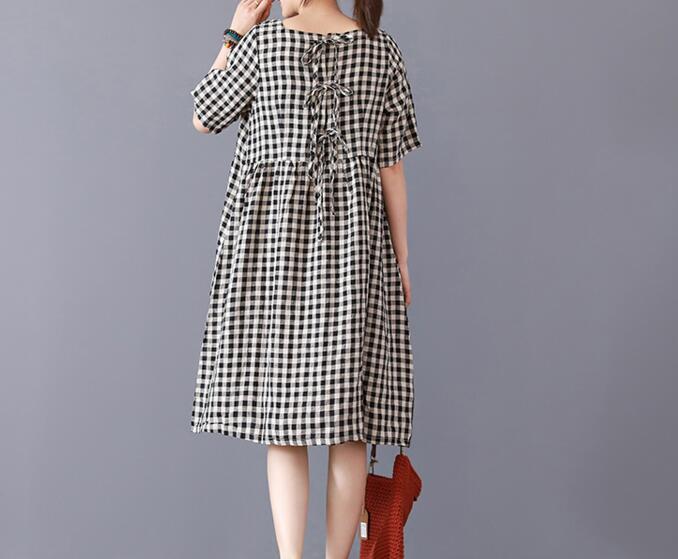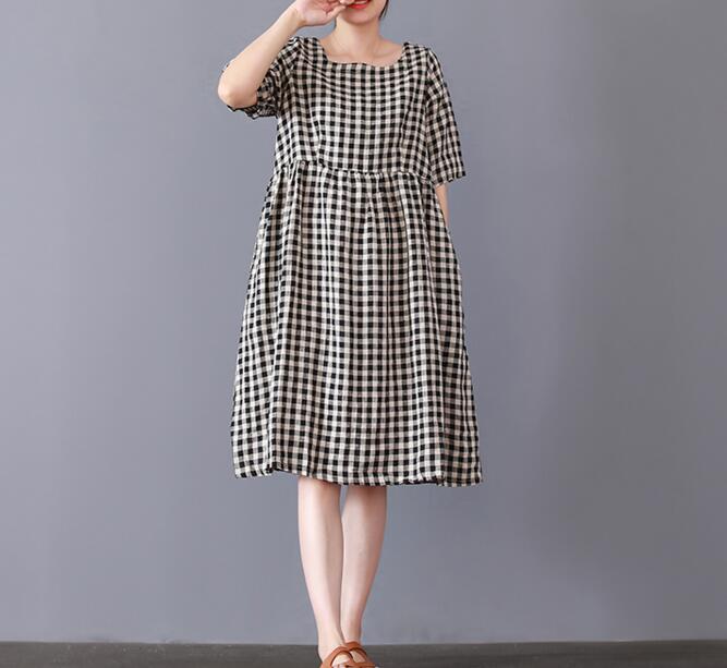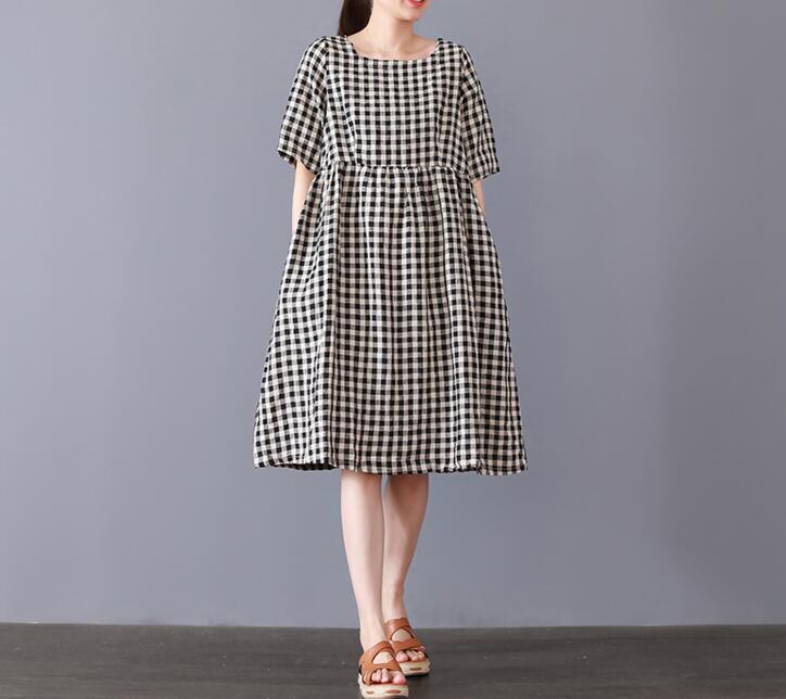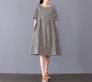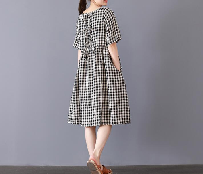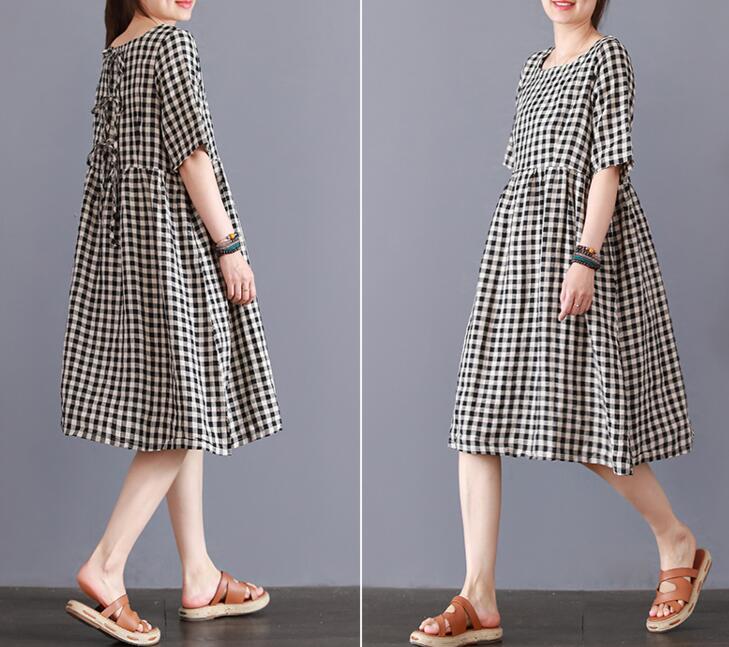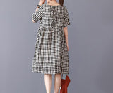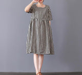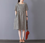 Plaid Cotton Linen Dresses Women Long Dresses Short Sleeve
