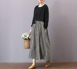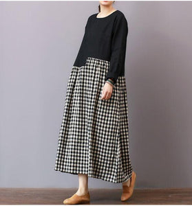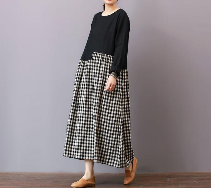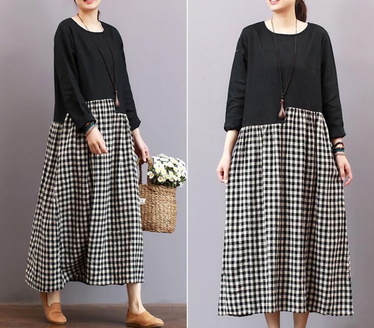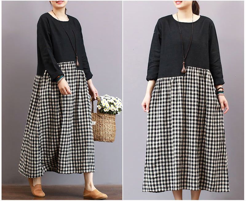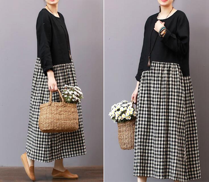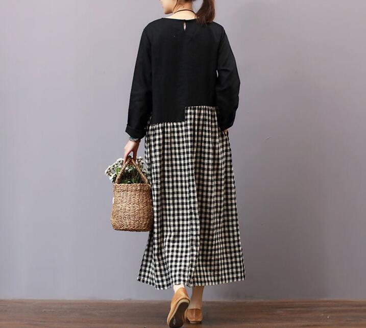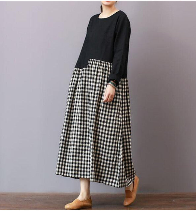 patch Work Cotton Linen Dresses Women Long Dresses Long Sleeve