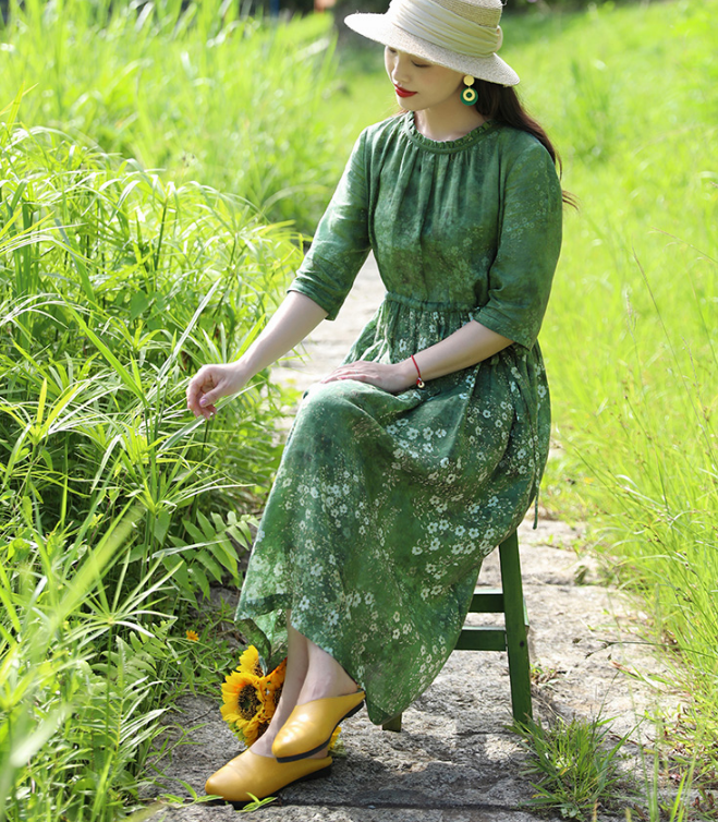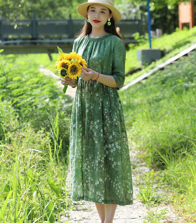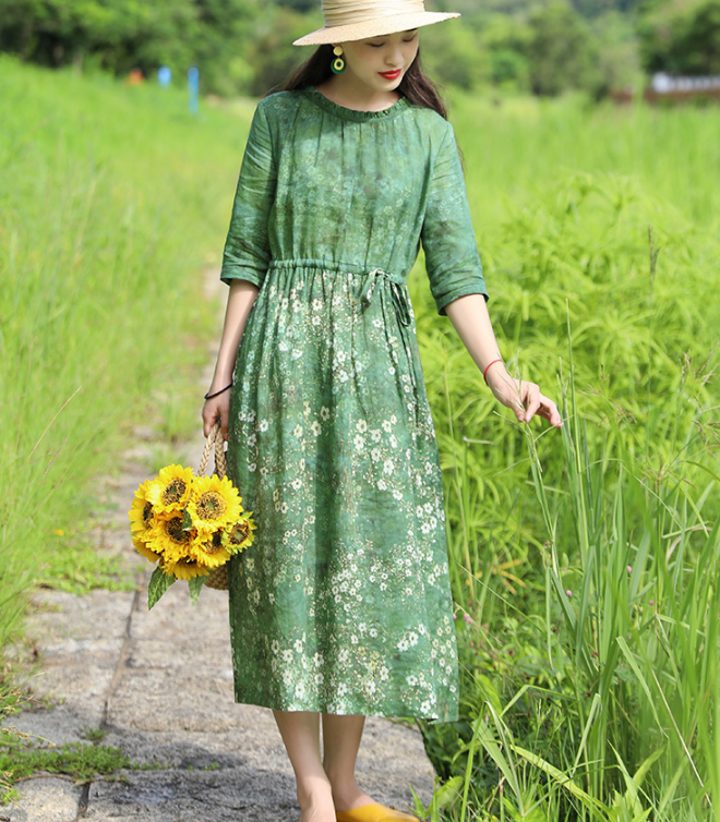 Green Floral Women Dresses Casual Summer Linen Women Dresses SJ97215