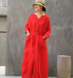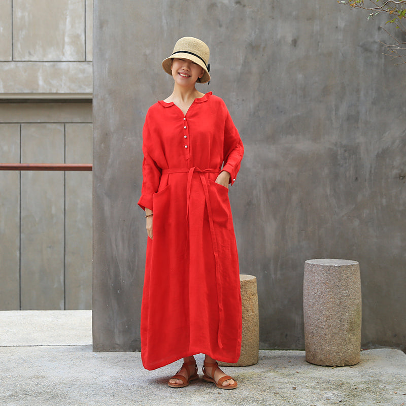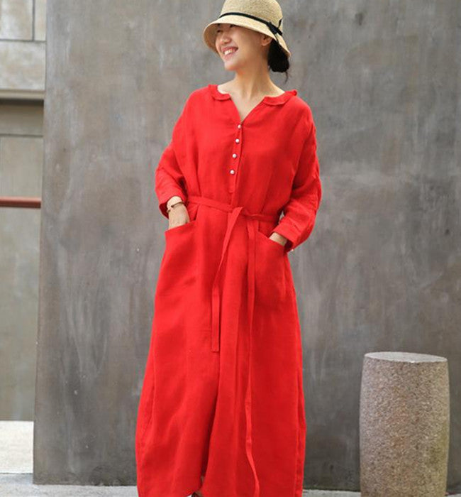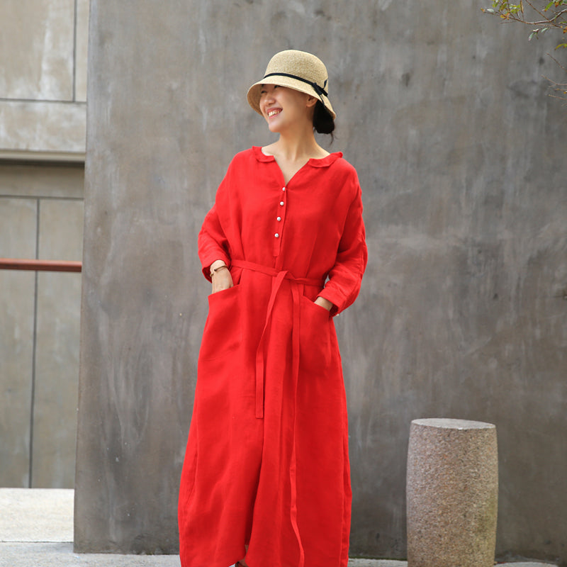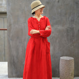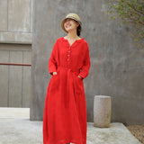Label Collar Red Women Linen Summer Dresses Buttons Sleeve Long Women Dresses Z972912