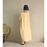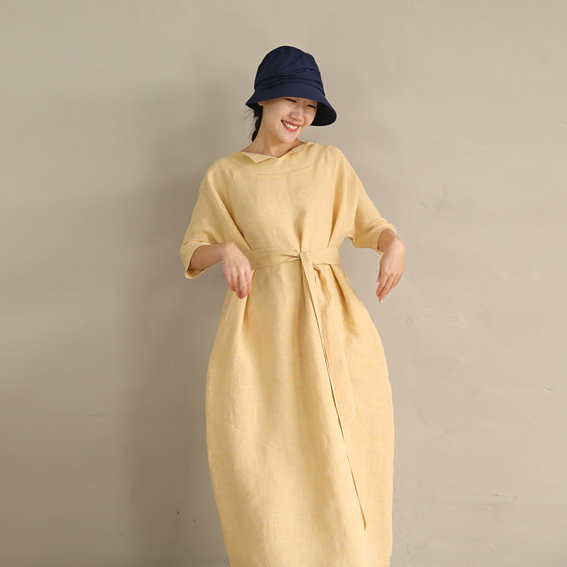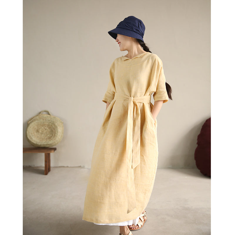 Yellow Label Collar Linen Waist Belt Dress Casual Summer Raglan sleeves Long Women Dresses Z972913
