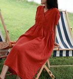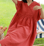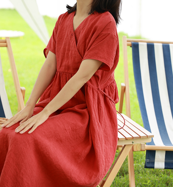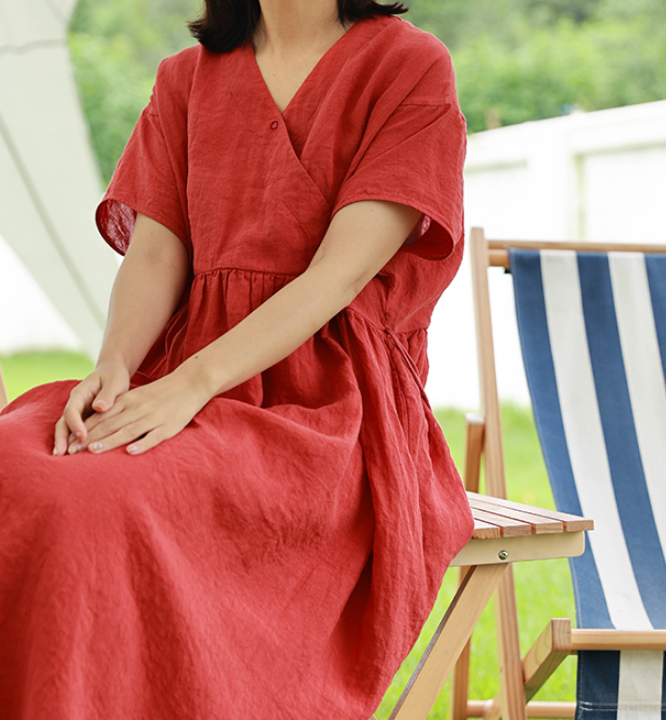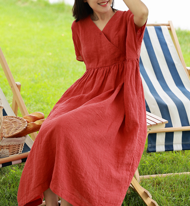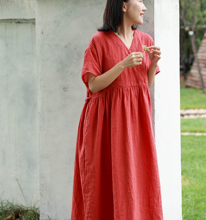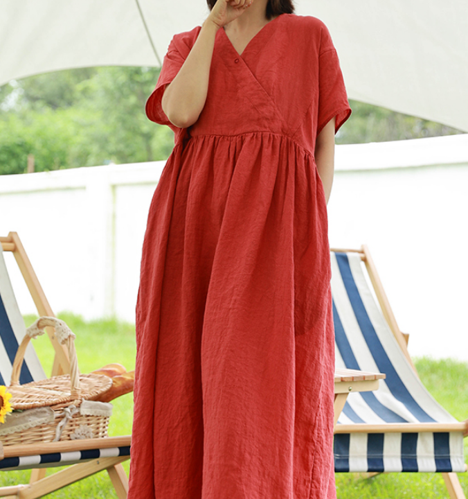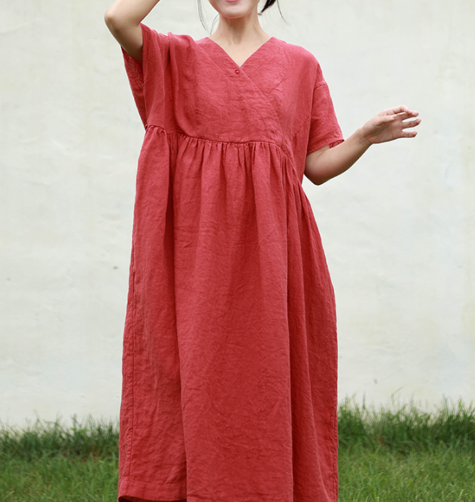 linen dresses with loose style.this women dresses is attractive with it's V-Collar design the pleated waist line is also very special.also comfy to wear it.We could also custom made with any other colors and size.please feel free to chat with us.