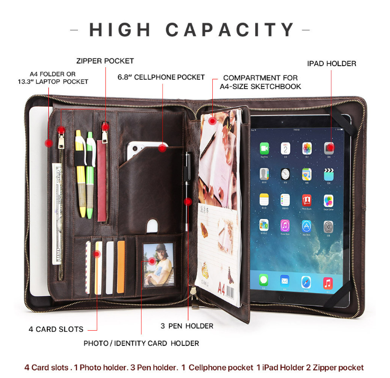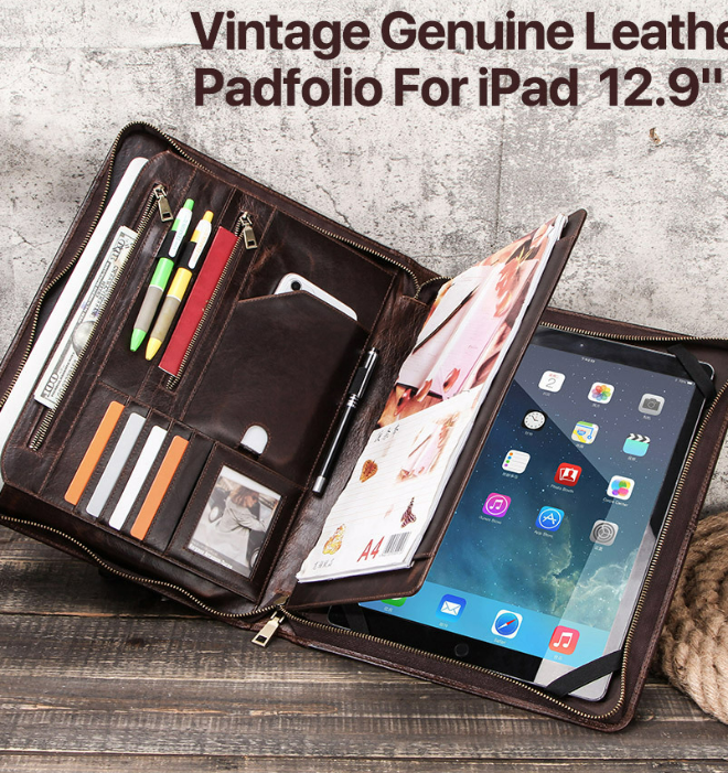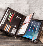 Men's Leather Portfolio iPad 12.9 Padfolio, Tablet Case, Document Folder Organizer with Pen Slot Zippered Writing Pad Card Pockets, Custom Name for Gift.