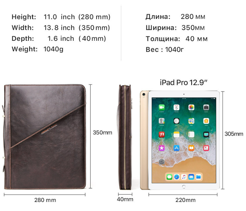 - 1 middle-sized zippered pocket for up to 10.5" ipad Pro/ducuments