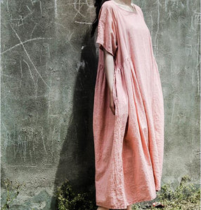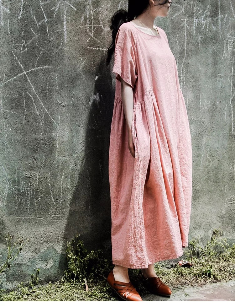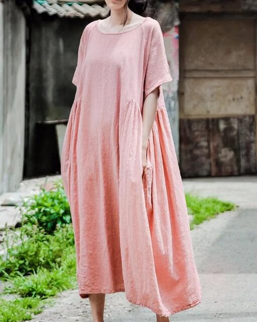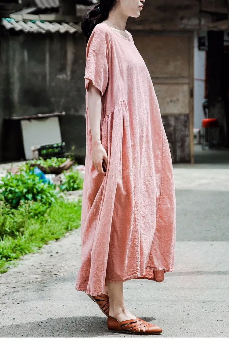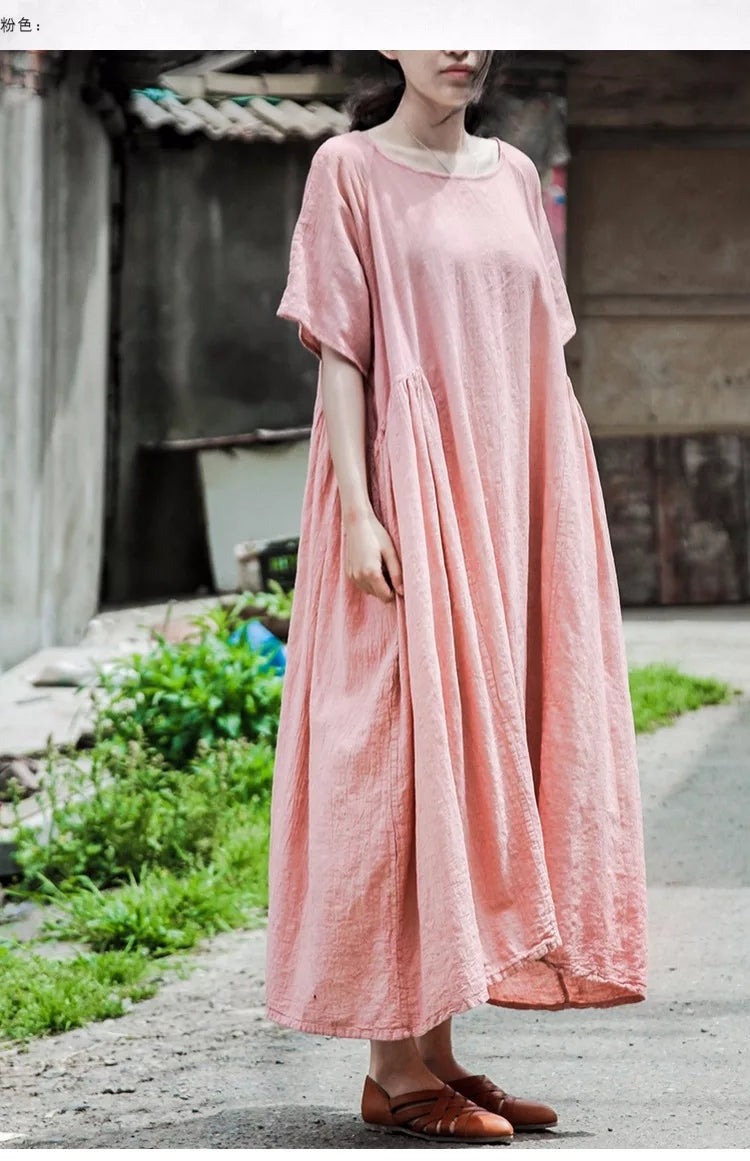 Solid pink linen dresses with o neck.this women dresses is attractive with it's pleated waist linen and loose fitting style,the shoulder sleeve is also very special ,very comfy to wear it