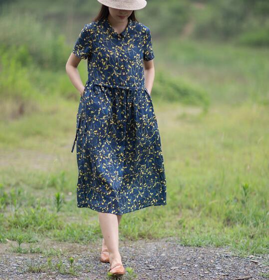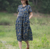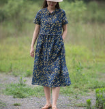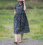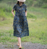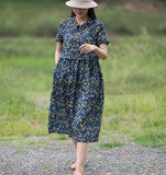 Print Floral 100% Linen Women Dresses Short Sleeves Summer Women Dresses XH9527