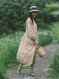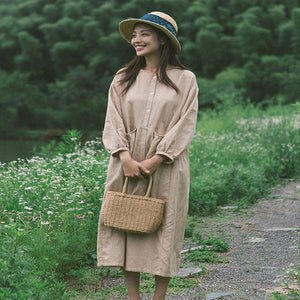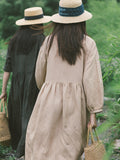 khaki Puff Dress Summer Casual Button Women Linen Dresses Long Seelve Dress ZF98407