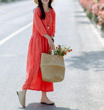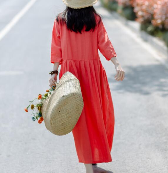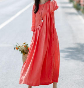 Pleated Pink Linen Women Dresses Pleated Spring Maxi Dresses D9504