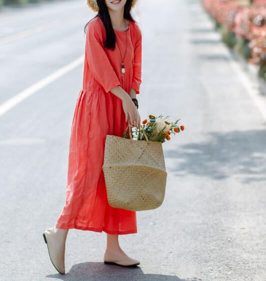 women linen dresses with pleated design ,3/4 sleeves,100% linen fabric ,O neck ,make you looks very grace,