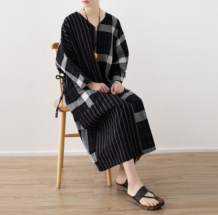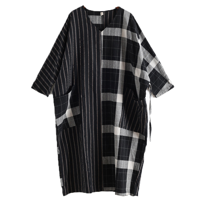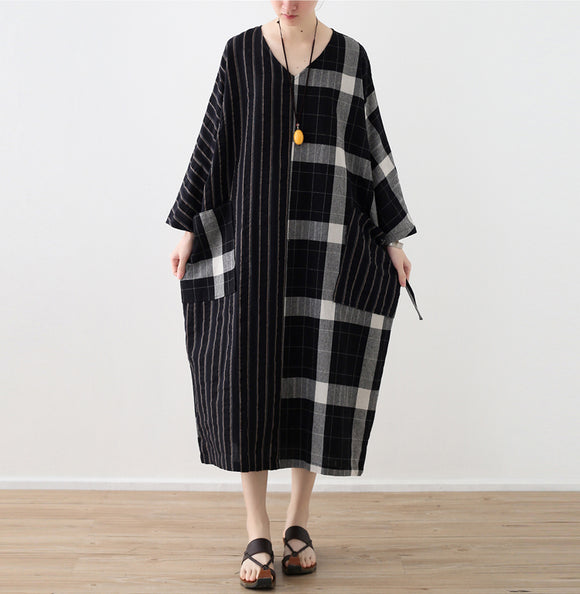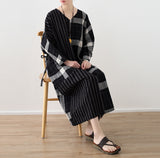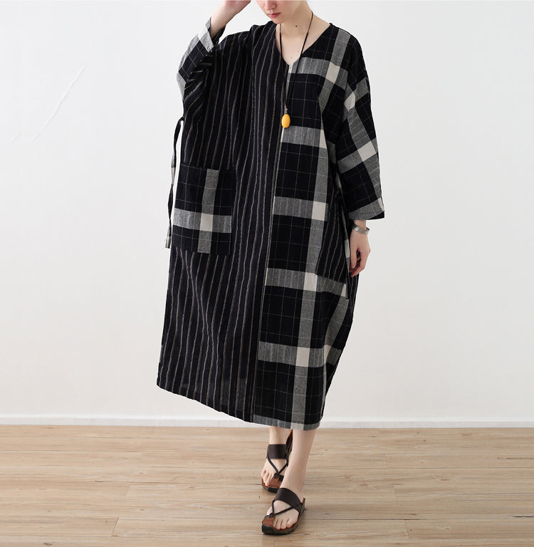 Plaid Stripe Patchwork V Neck Loose Dresses AMT962212