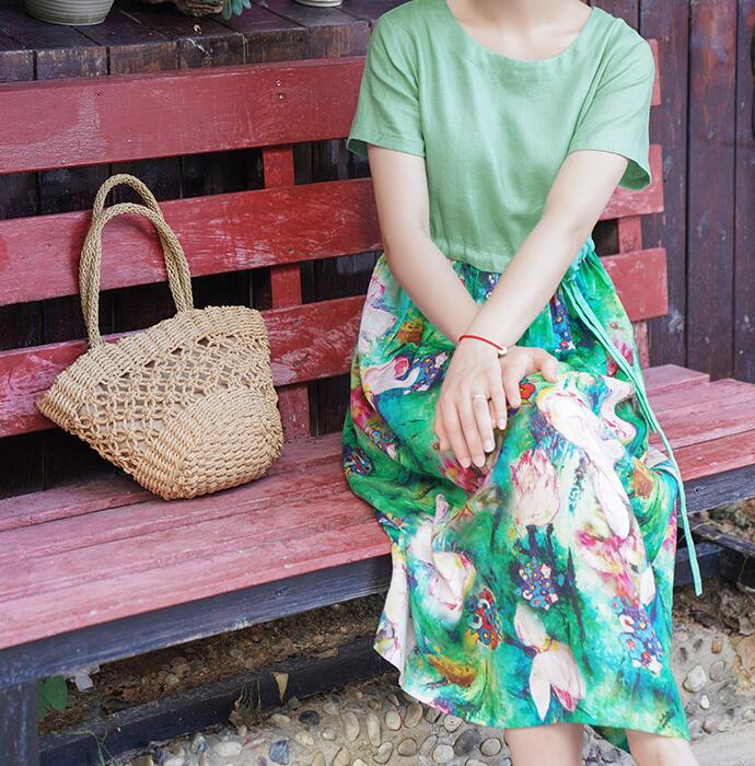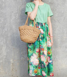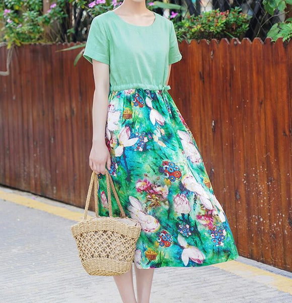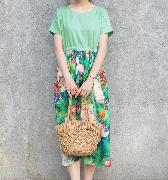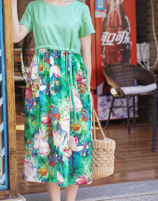 Patchwork Green Women Dresses Ramie Casual Linen Women Dresses Short Sleeve SSM97215
