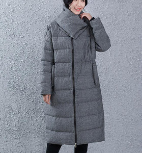 This is a winter down jacket fill with down.we design it with a very thick and warm style.this hooded down jacket could keep you very warm in the cold winter.the side pockets is very useful.a unique design women winter coat.